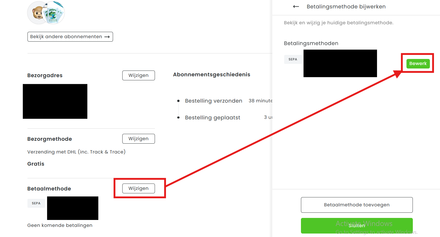 Klik op âwijzigenâ naast âbetaalmethodeâ. Klik daarna op âbewerkâ, voer de benodigde wijziging door en bevestig.